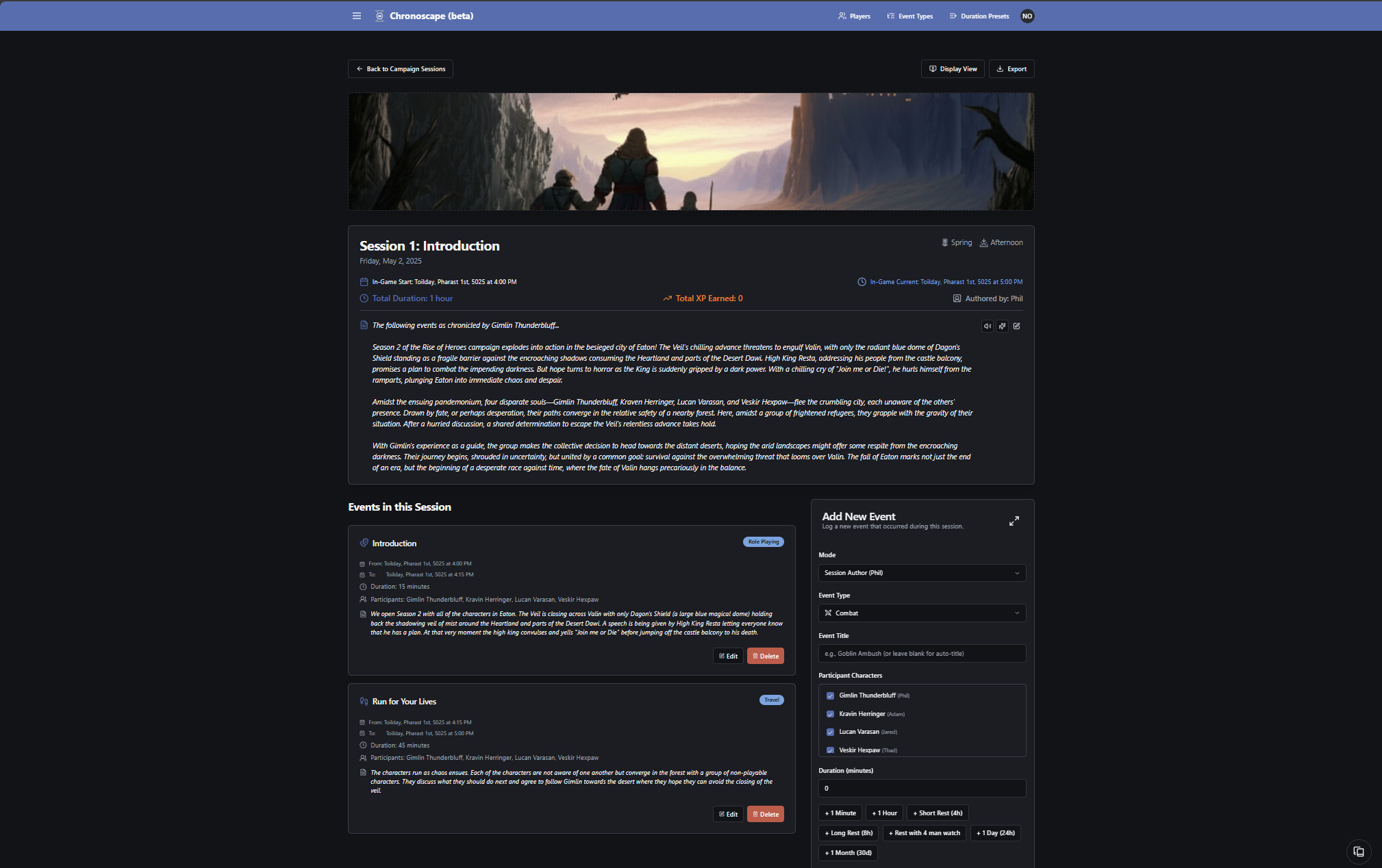 - Event Mode: This allows you to specify if the GM or the Player is authoring the event. This was created for our GM, because he liked to add “cut-scenes” to our sessions. These usually did not progress any time, so the event duration can be left at 0. But he could also provide an event that did progress time. Otherwise, the event is a player event.